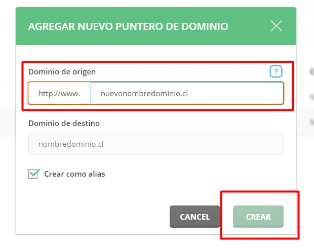 En seguida aparecerá una ventana emergente. En el campo “Dominio de origen” escribe el nombre de dominio al cual deseas parkear el dominio principal y haz click en “Crear”.